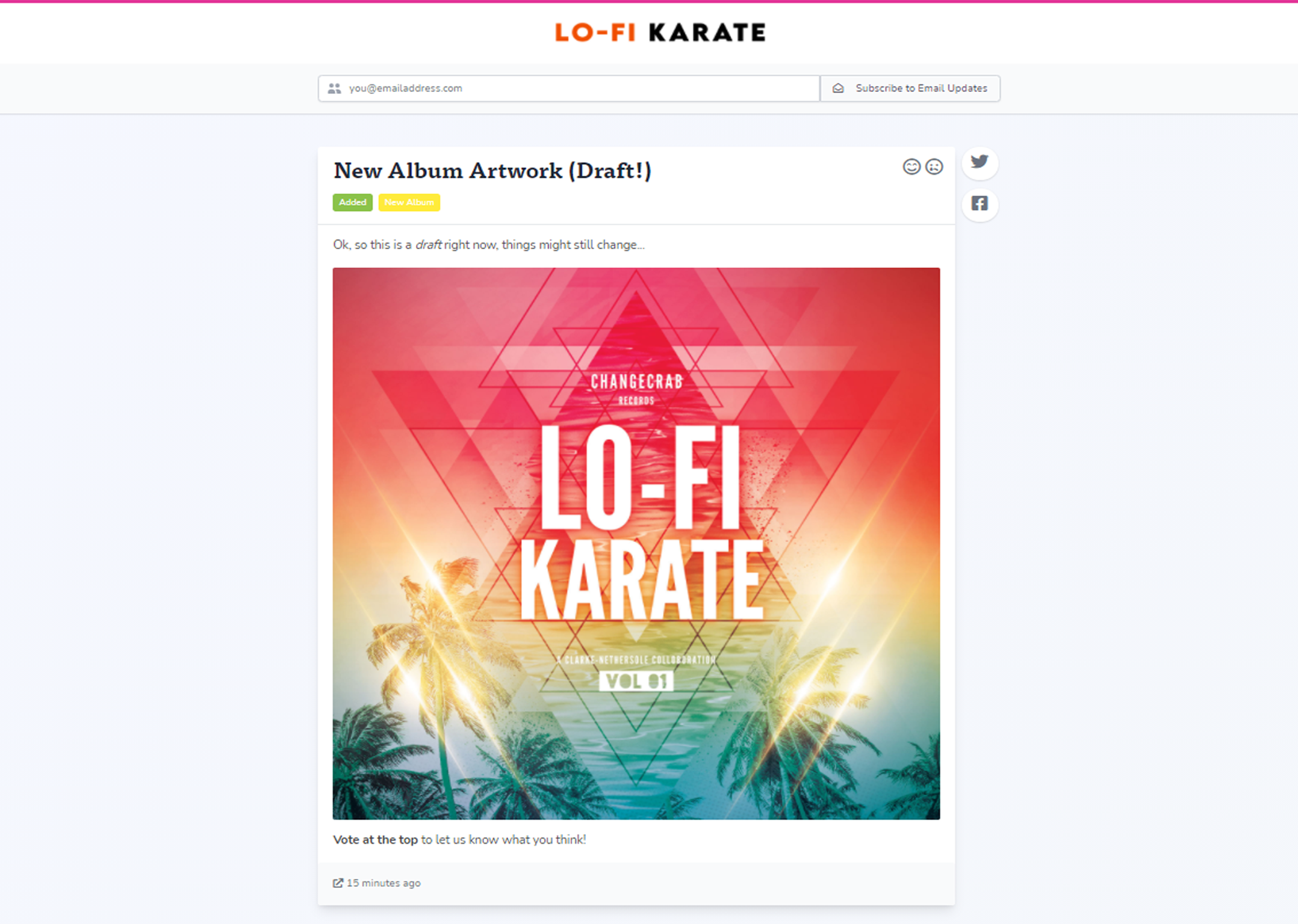 ChangeCrab can be used for anything from announcing your latest album to letting your readers know you’ve finished the first draft of your book to informing your potential clients that you’re now taking on new commissions. We offer full custom categories for all your updates and a free custom domain that fits in with your style.